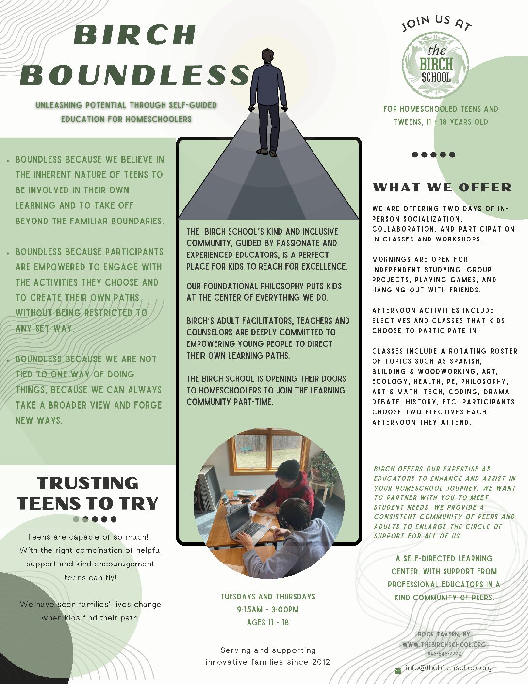 A safe place for teens to be with peers, to participate in choice classes and to be a part of a lively learning community, led by trained, experienced professionals.